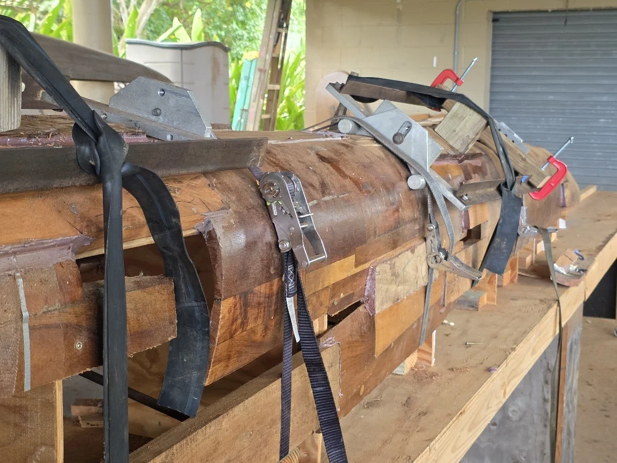 One particular canoe caught my eye- half of the hull was being entirely reconstructed. To ensure the new koa plank followed the original lines of the canoe, the builders used wooden templates resembling bulkheads. These ribs act as a guide, keeping the hull’s iconic “U” shape true to the original shape as the new pieces of wood are placed and glued down.